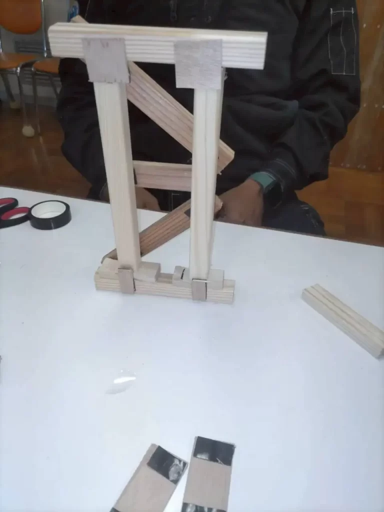 その後、10分の1スケールのトレーニングキットでショアリングの設定要領全体をイメージし、最後は実際の現場さながらの流れでショアリングを実施。